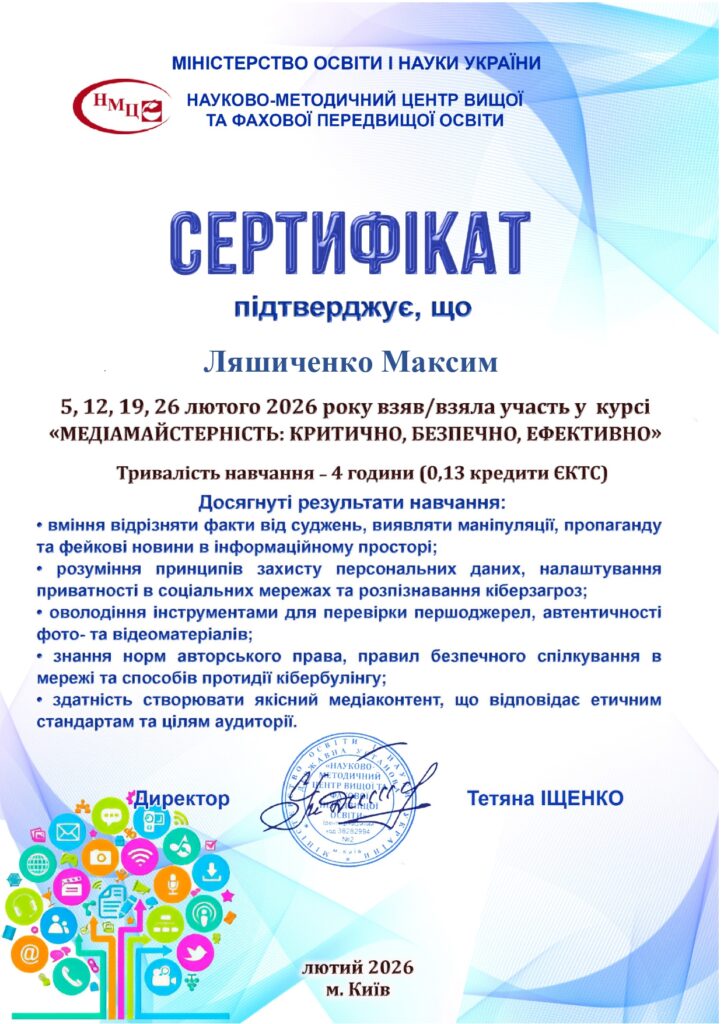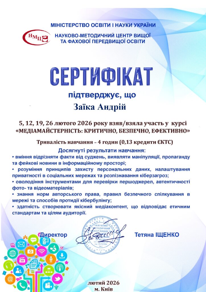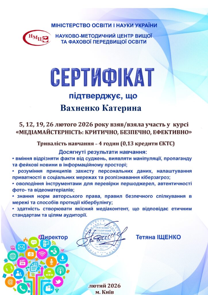Студенти нашого коледжу успішно завершили навчання за темою «Медіамайстерність: Критично, безпечно, ефективно».