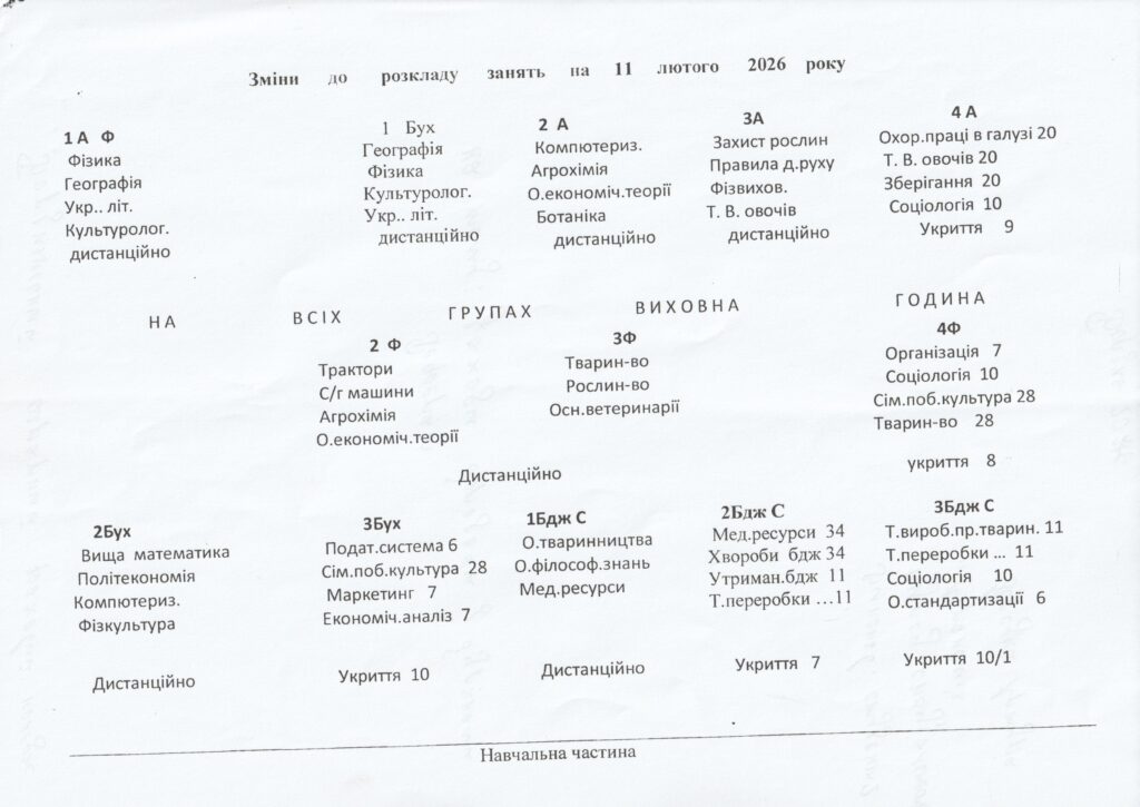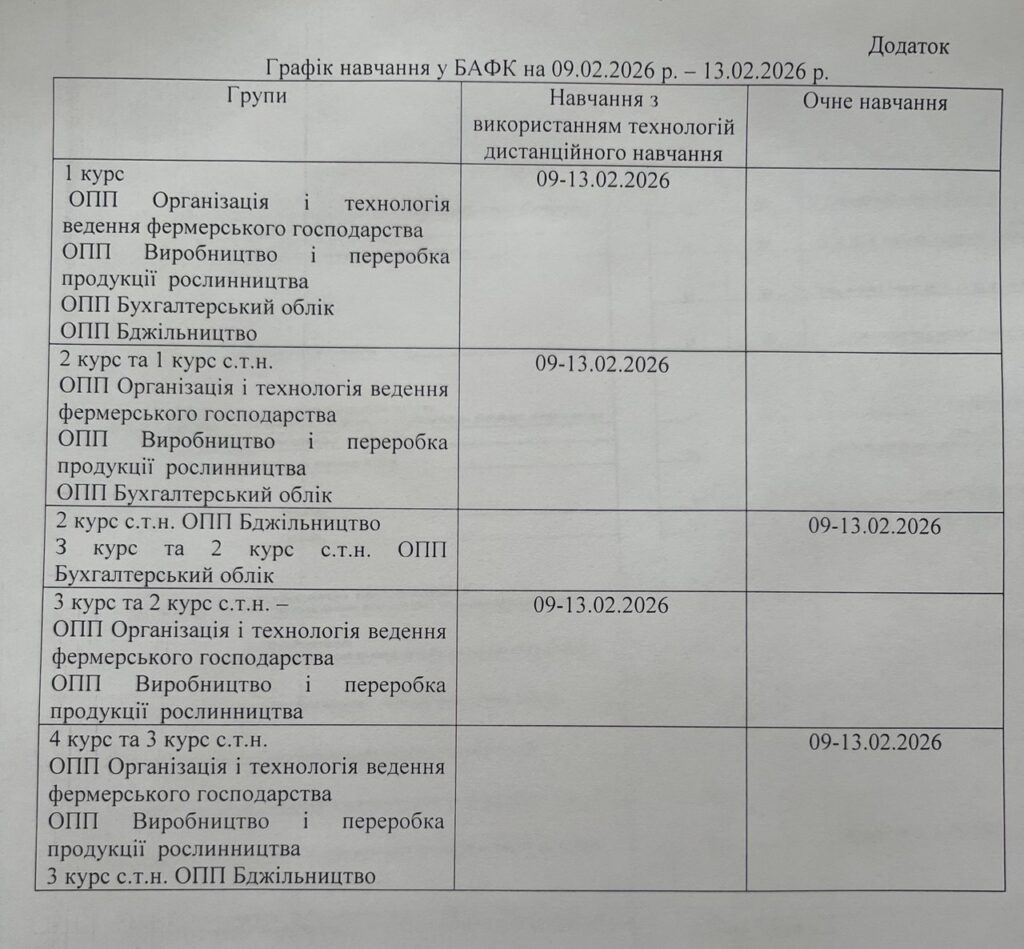 Розклади і графіки Зміни до розкладу 11.02 2026Графік навчання у БАФК на 09.02.2026 – 13.02.2026Постійний розклад